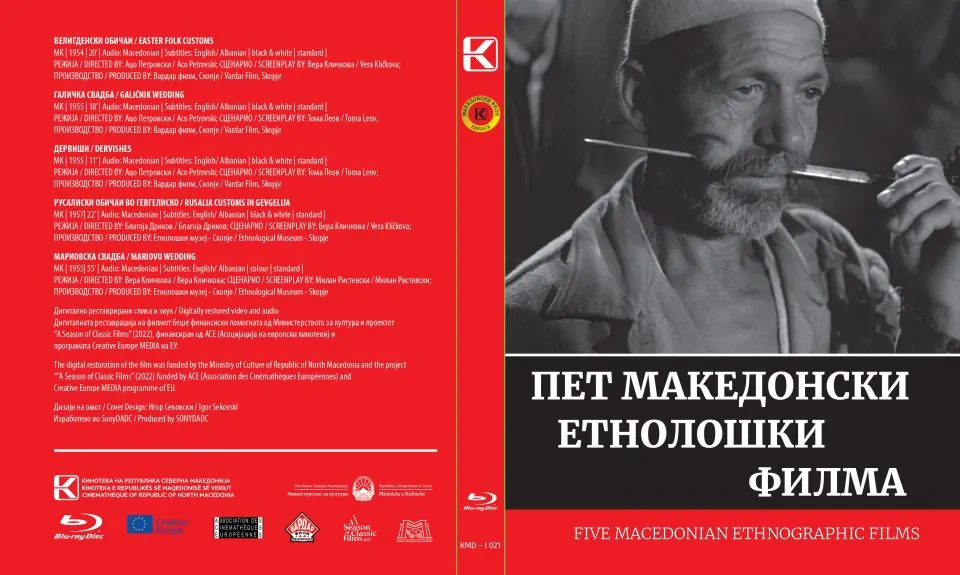Во таа насока, Кинотеката овие денови го издаде и новото блуреј издание кое содржи пет етнографски документарни филмови снимени при средината на минатиот век. Филмовите ВЕЛИГДЕНСКИ ОБИЧАИ (1954, р. Ацо Петровски), ГАЛИЧКА СВАДБА (1955, р. Ацо Петровски), ДЕРВИШИ (1955, р. Ацо Петровски), РУСАЛИСКИ ОБИЧАИ ВО ГЕВГЕЛИСКО (1957, р. Благоја Дрнков) и МАРИОВСКА СВАДБА (1955, р. Вера Кличкова) беа дигитализирани во нашата Кинотеката и реставрирани од страна на проф. м-р Владимир Павловски благодарение на проектот „Сезона на филмски класици“ реализиран од страна на Асоцијацијата на европски кинотеки (ACE – Association des Cinémathèques Européennes), а финансиран од програмата Creative Europe MEDIA на Европската Унија.